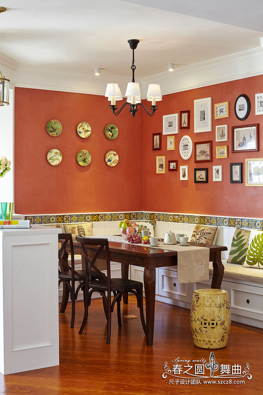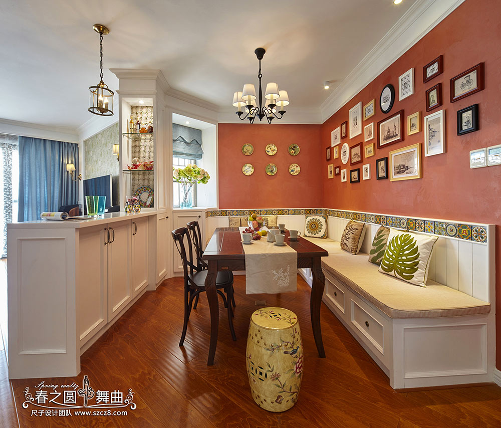 本案是简美风,在色彩的处理上比较大胆,让众多颜色能和谐相处。每一个空间的颜色富于变换多样,色彩在空间分布上、前后位置关系十分的注意,有主又次,不喧宾夺主。浓郁的色调使家居空间温馨而醇厚,更具生活气息,丝毫没有令人不适的压迫感,在忙碌中坐下来,喝一杯咖啡,聊聊点滴生活,香浓回甘中享受安闲。