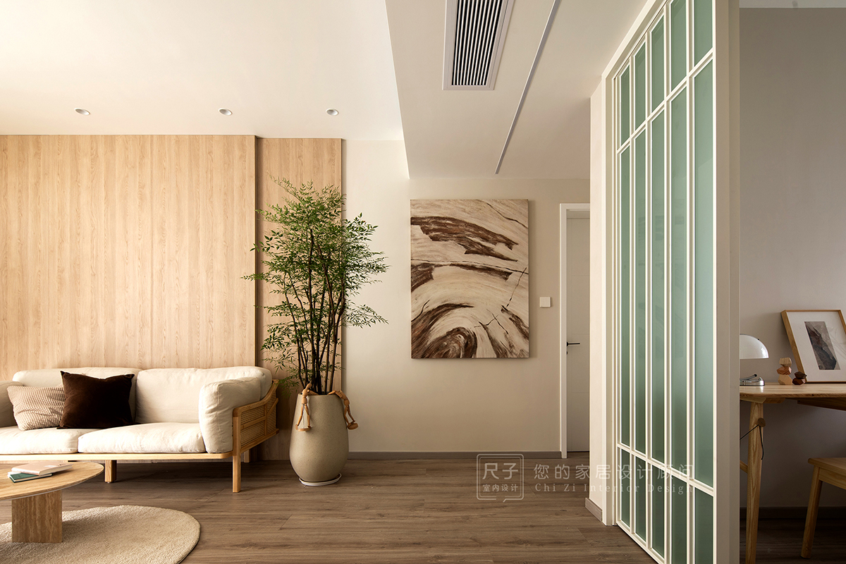 房子是标准的三室两厅户型,设计师以原木色+灰白为基调,部分墙面选择肌理质感丰富的艺术涂料装饰,再辅以绿植作点缀,打造阳光满屋,自然感十足的日式禅意风格。