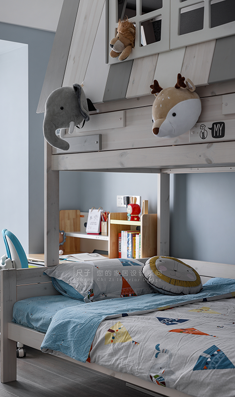男孩房往主卫,衣帽间方向扩大,增设衣柜和书柜