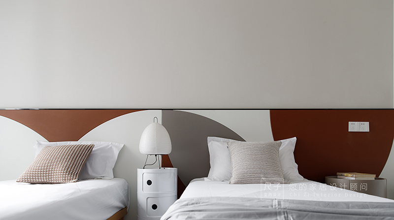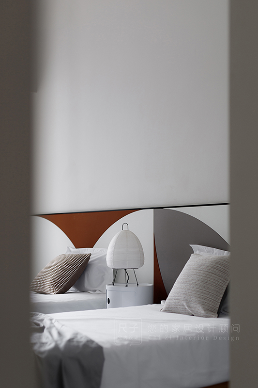 沙发背景,地面材质的拼贴,色彩搭配选择都是优先考虑到功能、视觉等因素而去设计。通过曲线的延展,从玄关到客餐厅,从客餐厅到房间,想在规整次序的空间里增加律动感,意料之中,也在意料之外。
