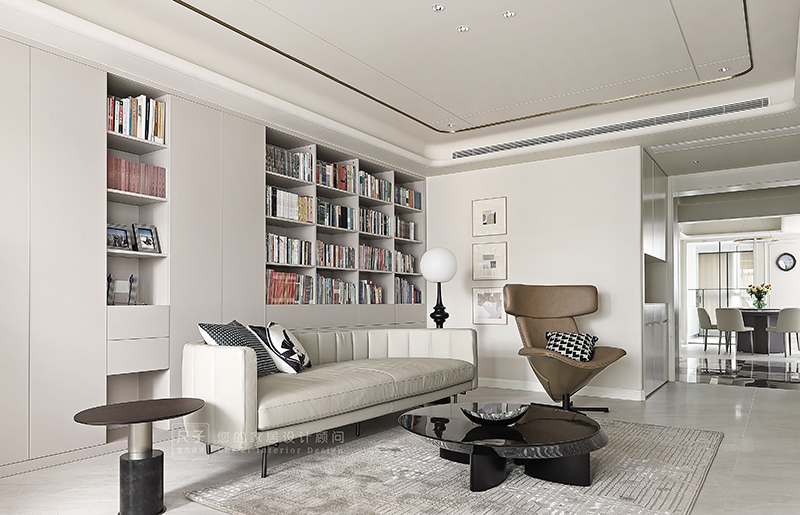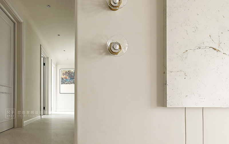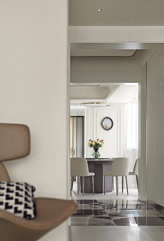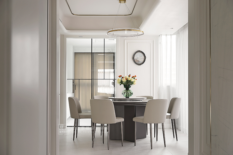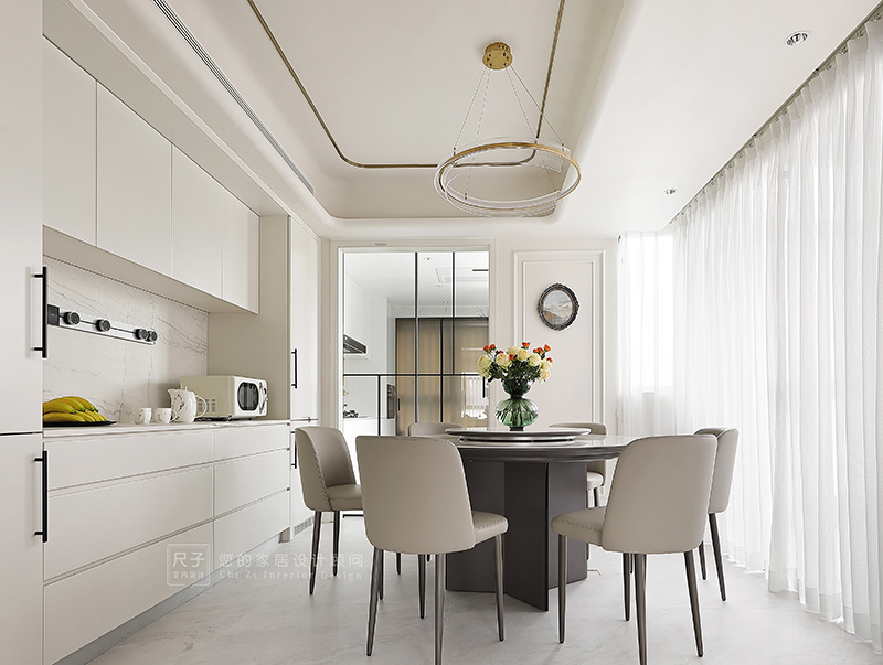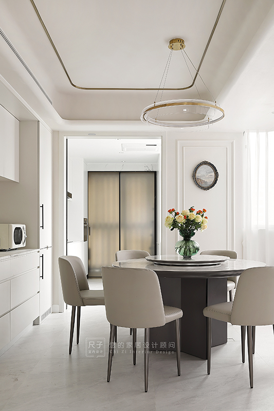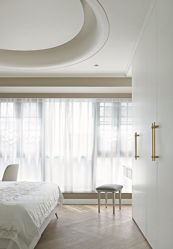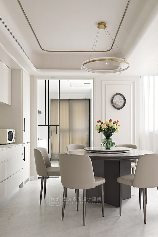 以心筑家,把握每一寸美的元素,在奶油色的基调中,法式线条元素结合,呈现华丽且温和的氛围。