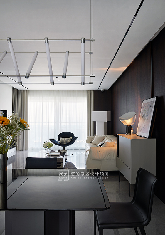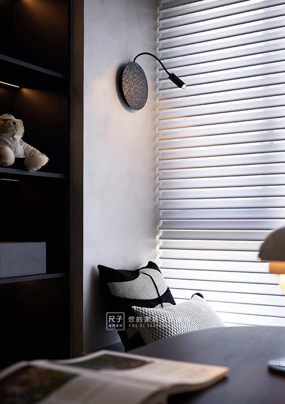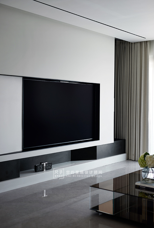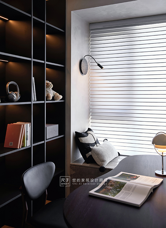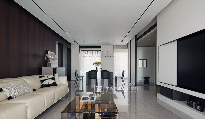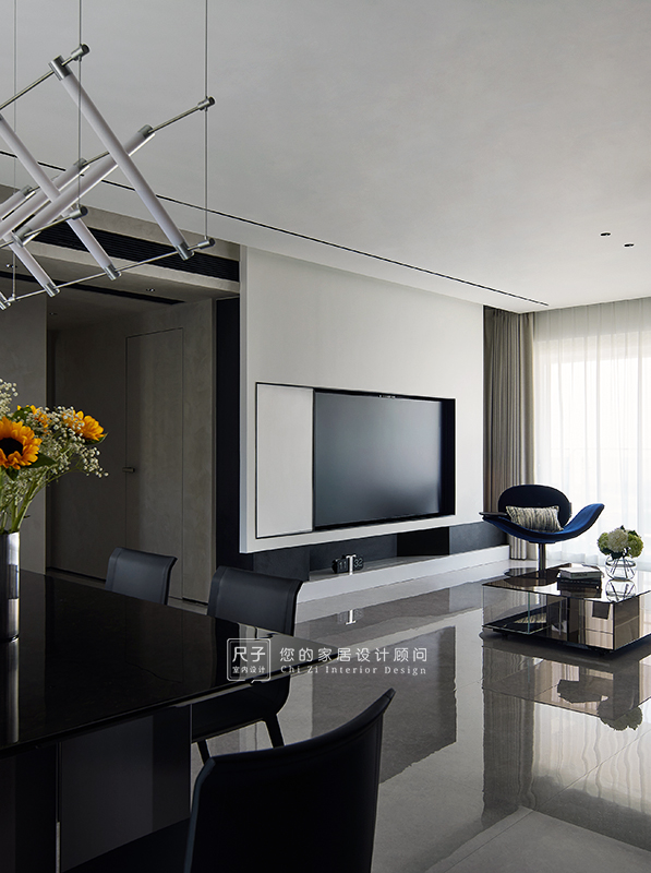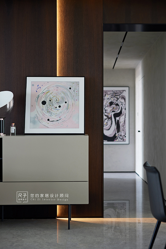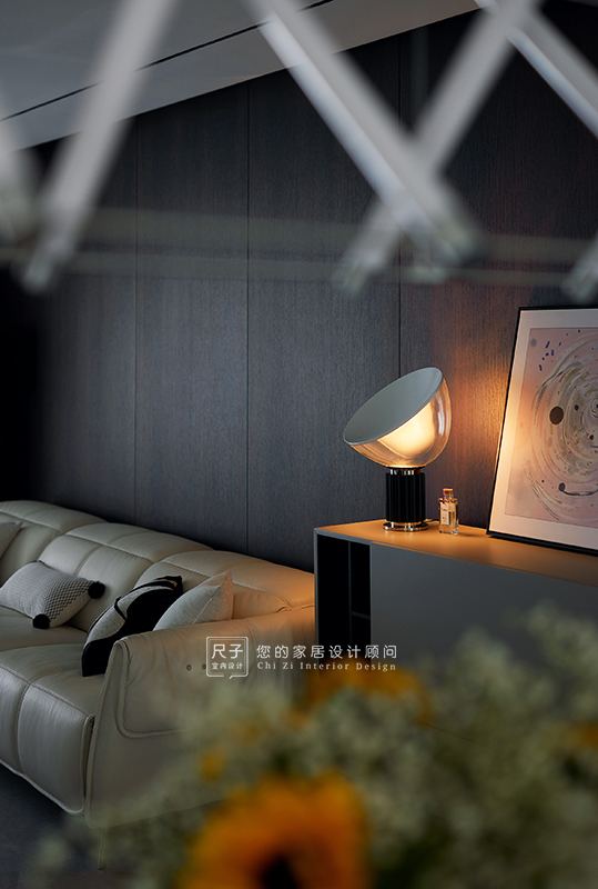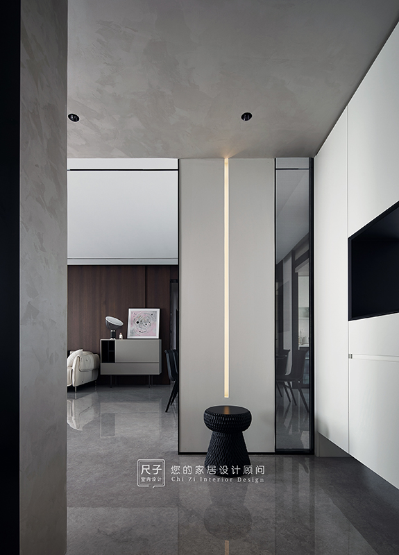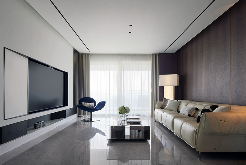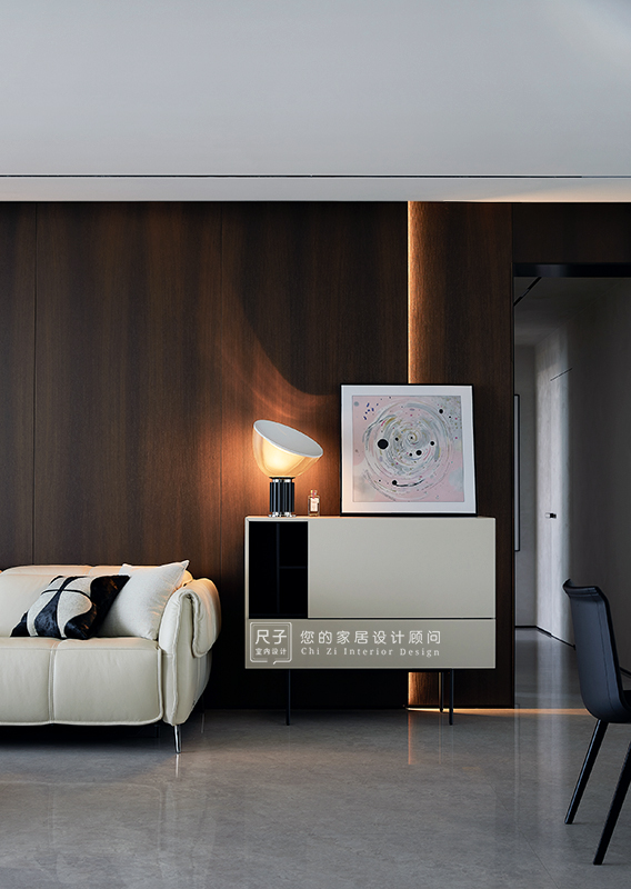 整个家环环相扣的布局,沙发背景深色的木饰面,电视背景浅色的涂料,深浅交融之间,形成一种整体又干练的质感。