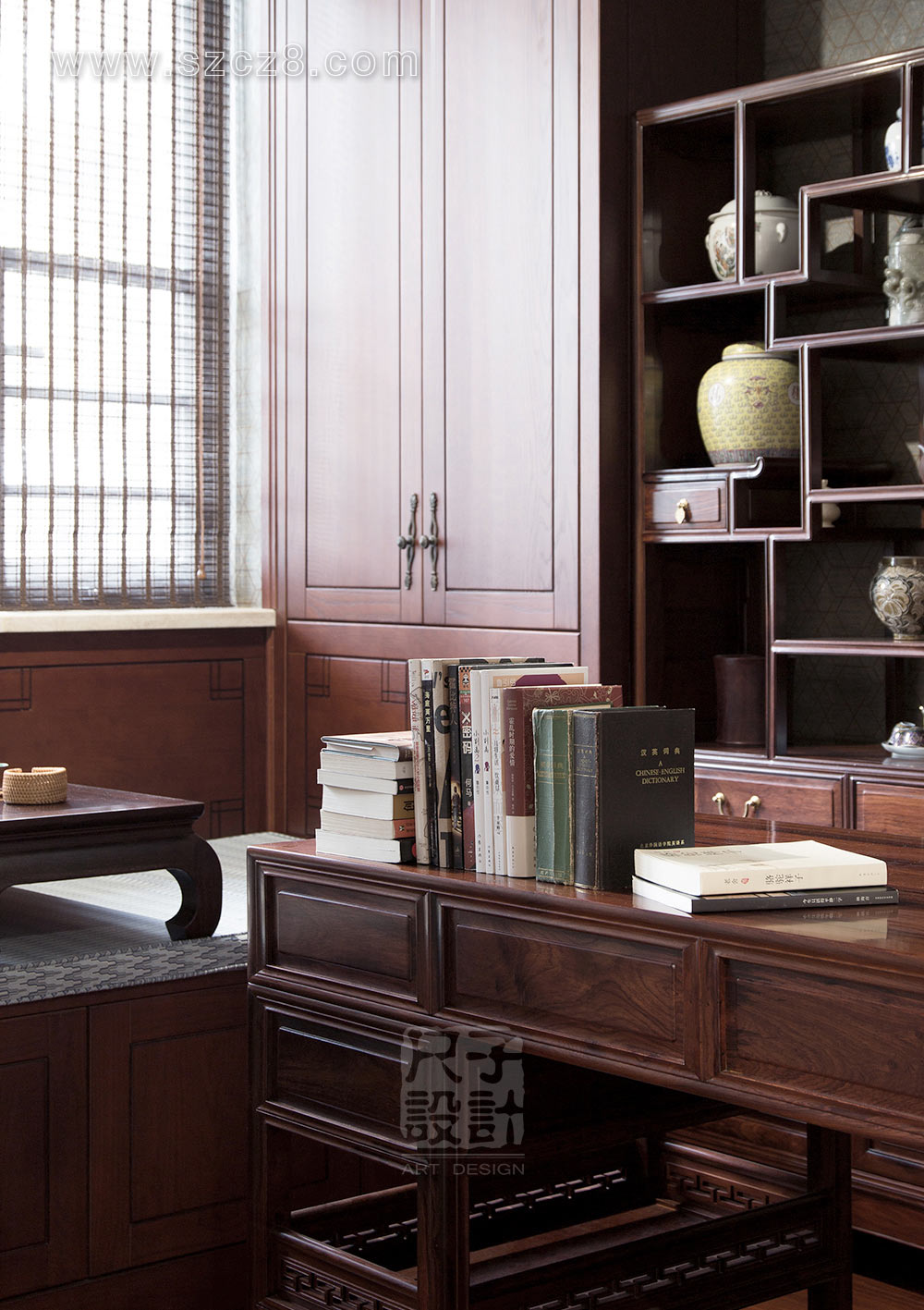 业主L小姐温婉娴静,爱国画爱刺绣也爱佛经文学;男主人则内敛稳重,爱品茶亦爱古物收藏;基于对中式风格的喜爱,及考虑现代居住的便捷与舒适性来确定整体的中式基调。古朴的中式家具在尚未设计方案时便已敲定,因此我们以家具的重色与软装的搭配中和协调,将男主人的大气与女主人的柔美融入到家的设计中。