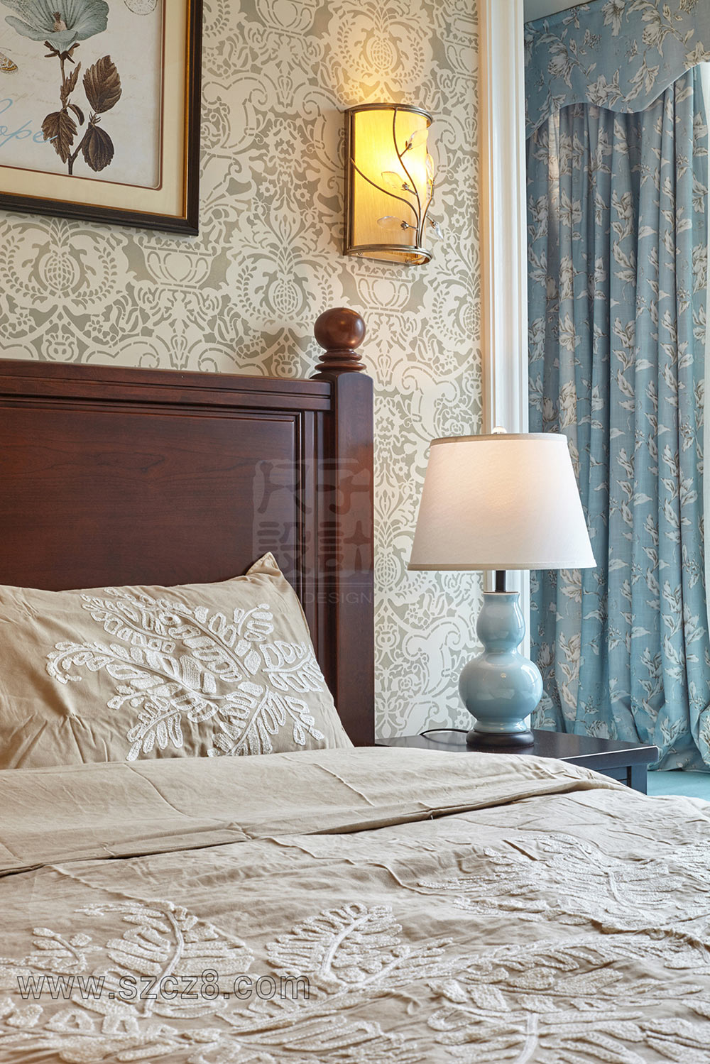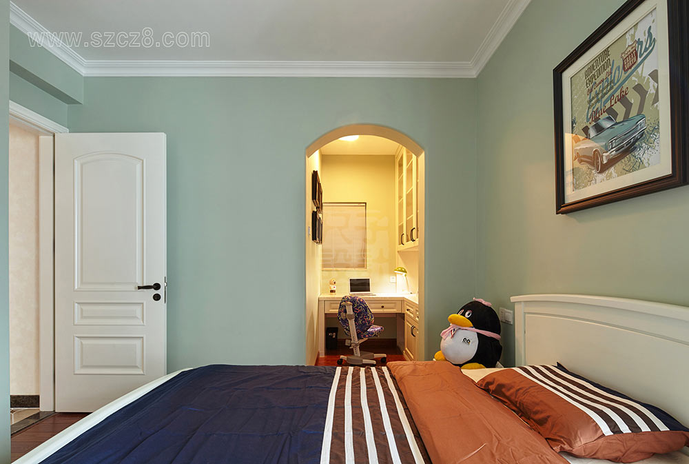 本案例设计师在整体风格的考量上,没有做过多的硬装造型设计,主要在几个空间衔接的位置上做了简单的造型处理,并运用材质的搭配与细节上的处理达到整体的效果。主空间运用奶咖色系的涂料和自然色系的美式家具进行搭配,又辅以冷色调软装布艺的修饰,营造出别具一格的现代休闲美式的浪漫情怀,简约而有味道。